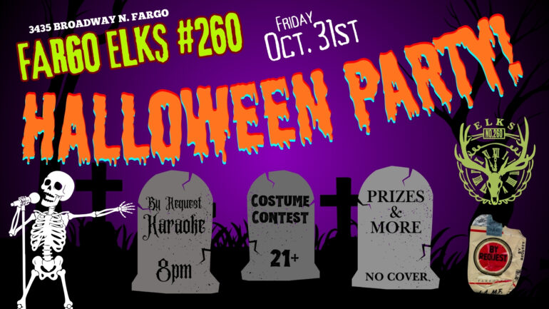 Get ready for a spooktacular night at Fargo Elks #260’s Halloween Party! Join us for an unforgettable evening with BY REQUEST KARAOKE, A COSTUME CONTEST w/ prizes & much more Halloween fun! Don’t miss out on the chance to celebrate Halloween in style—mark your calendars and bring your friends for a night of delightful & spooky fun! 21+ event