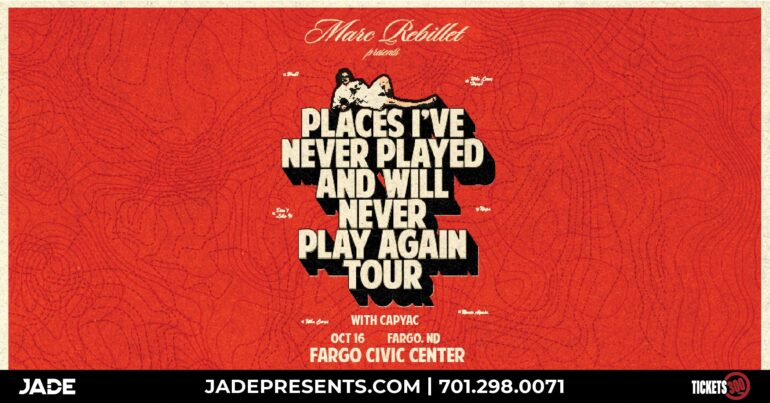Marc Rebillet – Places I’ve Never Played & Will Never Play Again Tour with CAPYAC comes to the Fargo Civic Center on Thursday, October 16. Local presale runs June 11 at 10AM to June 12 at 10PM using code IMPROVKING at → bit.ly/3FHWDvs. Tickets on sale June 13 at 10AM.