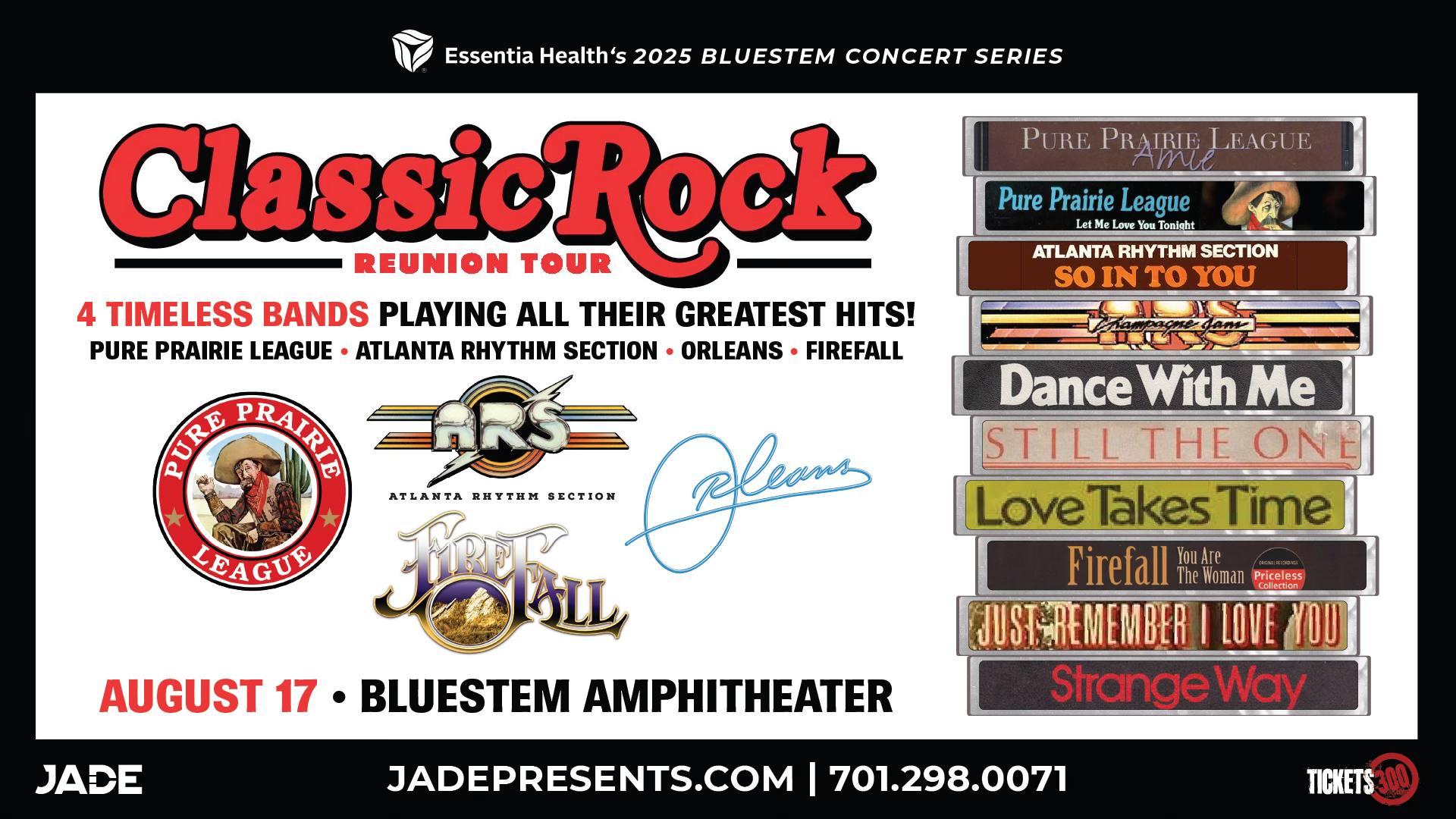 Bluestem Amphitheater 801 50th Ave S, Moorhead, MN, United StatesClassic Rock Reunion brings together four legendary bands for one unforgettable night of timeless hits and feel-good vibes! Join Pure Prairie League, Atlanta Rhythm Section, Orleans, and Firefall as they take the stage to deliver the songs that defined a generation. Essentia Health Presents: Classic Rock Reunion with Pure Prairie League, Atlanta Rhythm Section, Orleans & Firefall on Sunday, August 17 at Bluestem Amphitheater. Local presale starts Thursday, April 17 from 10AM-10PM using code BLUESTEM2025 at → bit.ly/3YmN2jJ. Tickets on sale […]