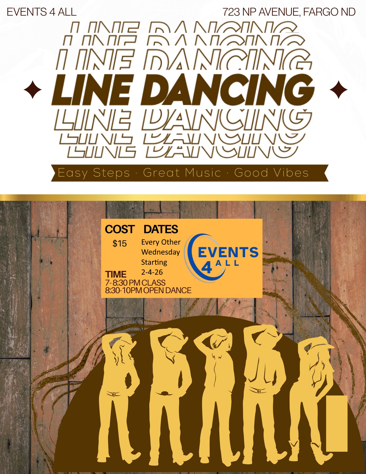 Events 4 All 723 Northern Pacific Ave, Fargo, ND, United StatesDust off those boots and bring that big Wednesday‑night attitude. Whether you’re a seasoned step‑stomper or you’ve never lined up for anything but a buffet, this class is your chance to jump in. From 7–8:30 PM, we’re teaching the moves loud and proud — then the floor opens up for anyone bold enough to show off what they’ve got. Class 7:00-8:30 and Open Dance 8:30-10:00 Come ready to laugh, learn, and light up the room. 🤠👢🕺 Events 4 All 723 […]