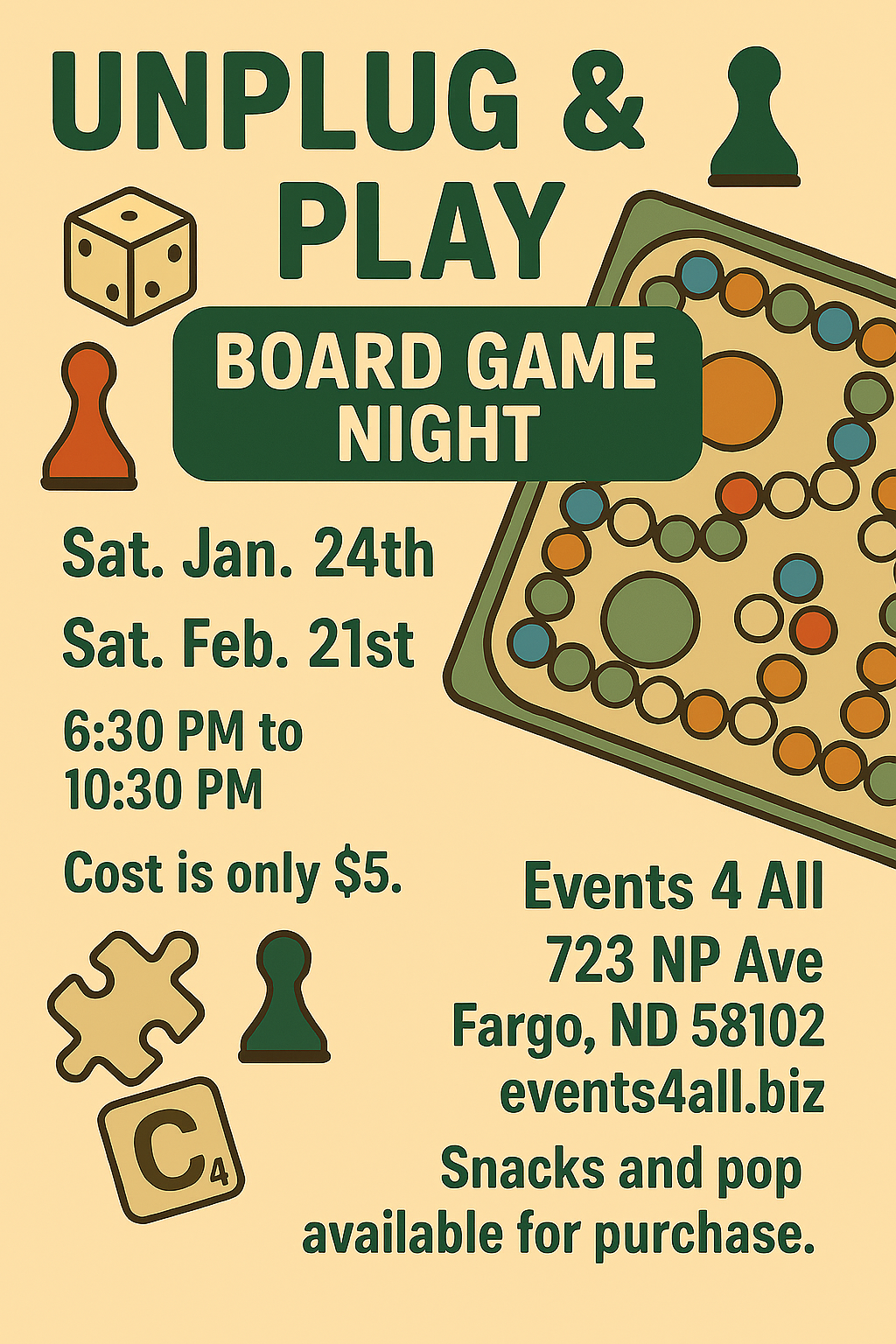 Events 4 All 723 Northern Pacific Ave, Fargo, ND, United StatesLooking for a fun night out? Join us for Unplug & Play, a relaxed and social board game night! Whether you love strategy games, party games, or just want to meet new people, there’s a seat at the table for you. Dates: Saturday, January 24thSaturday, February 21st Time: 6:30 PM – 10:30 PM Location: Events 4 All723 NP Ave, Fargo, ND 58102 Cost: Only $5 per person Snacks and pop available for purchase Bring your favorite board game or try something new—either way, come […]